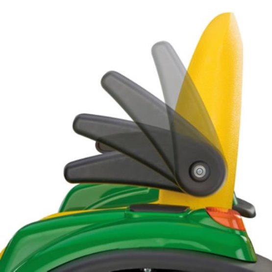 Der John Deere Ground Force hat alles, was man für eine sichere und bequeme Unterhaltung Ihres Kindes braucht. Der in zwei Positionen verstellbare Sitz kann an jeden Fahrer angepasst werden und hat zwei Armstützen, die bei Bedarf hoch zur Rückenlehne geklappt werden können. Er lässt sich super leicht fahren! Die Fußstützen sind breit und stabil. Auf der rechten befindet sich das Gaspedal das, wenn es losgelassen wird, zur Bremse wird und den Traktor automatisch anhält. Über den Schalthebel lassen sich zwei Geschwindigkeiten und der Rückwärtsgang einstellen. Die zweite, höhere Geschwindigkeit kann blockiert werden, wenn der kleine Fahrer noch unsicher ist. Die Reifen mit Profil sorgen für einen optimalen Halt und ermöglichen es, dass der John Deere Ground Force Steigungen von bis zu 10 % leicht bewältigen kann.
