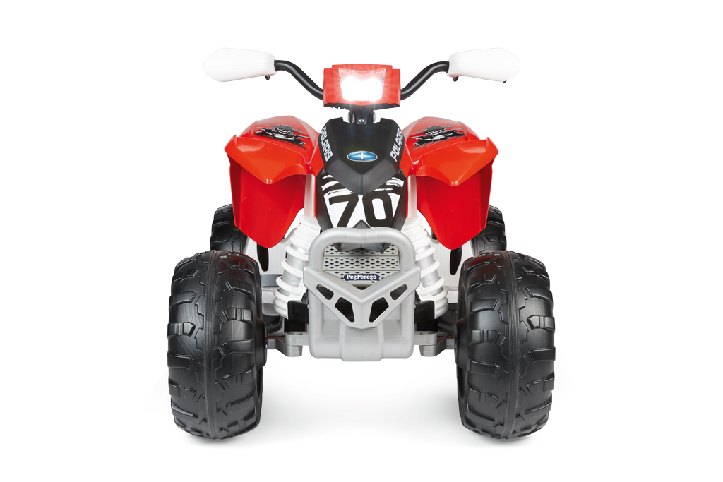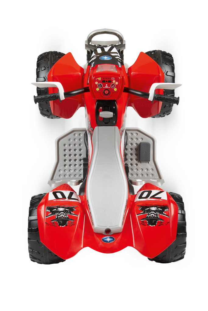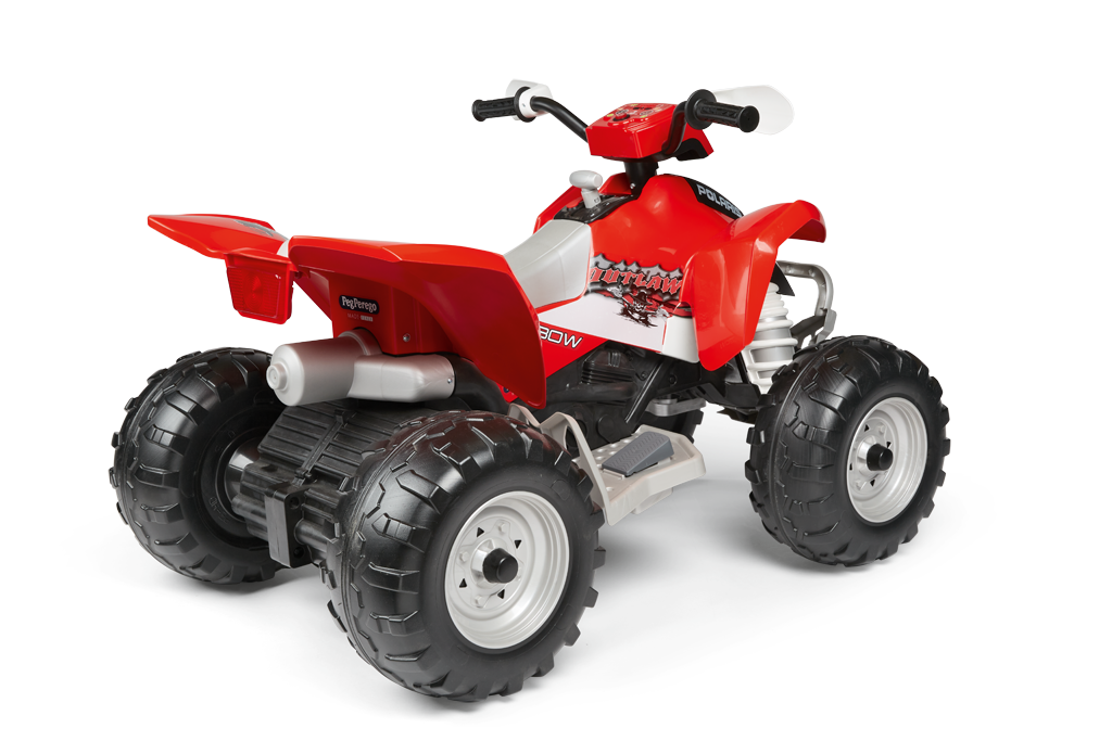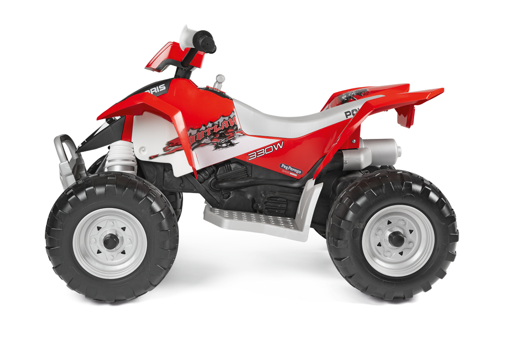 Höchstleistung auch bei großer Steigung und im unebenen Gelände verspricht  das      QUAD POLARIS OUTLAW     Qualität vom bekannten europäischen Hersteller  PEG PEREGO.     Ein italienisches Unternehmen mit globaler Vision.Seit über 60 Jahren stellt PEG PEREGO in Italien mit besonderer Leidenschaft eine große Vielfalt an Produkten für Kinder und Eltern her, die auf unsere Werte setzen: Erfahrung, Qualität und Sicherheit. PEG PEREGO bietet einen umfassenden Kundendienst, eine stets aktualisierte Internetseite und ein innovatives Service-Portal.          Wahlweise mit dem 12V/8Ah Akku, oder dem größeren 12V/12AH Akku.Der 12V/12AH Akku hat eine um ca. 50% längere Laufzeit pro Ladung als der 12V/8AH Akku. Das Quad ist ein detailgetreuer Nachbau des original Quad des berühmten US-amerikanischen Herstellers Polaris. Perfekt bis ins kleinste Detail, übernimmt es alle Formen und Aufschriften des Originals. Das Polaris Outlaw ist das Elektro-Quad mit aufladbarer 12 V-Batterie für Kinder ab drei Jahren, die Lust auf Abenteuer haben.     Maximale Stabilität selbst in unwegsamem Gelände. Kurzweilige Nachmittage an der frischen Luft zu verbringen, ist für alle Kinder ein tolles Spiel! Der Polaris Outlaw ist der ideale Begleiter, um sich auch auf unwegsamen Strecken ins Abenteuer zu stürzen. Dafür sorgen vier Räder mit Profil und breite Fußstützen, die genügend Platz für die Füße lassen. Der vordere Überrollbügel dient als Stoßstange. Das angenehme Design sorgt dafür, dass quasi jedes Kind bequem mit dem Polaris Outlaw fahren kann; Beine, Arme und Rumpf haben immer ausreichend Platz, egal wie groß oder klein das Kind ist.     Geradlinige Lenkung, bequeme Fahrt.Der Polaris Outlaw verfügt über viele Details. Der widerstandsfähige Lenker aus glänzend lackiertem Eisen hat zwei Gummigriffe und Handschützer. Am Tachometer befindet sich ein Schlüssel, mit dem das Anlassen simuliert werden kann. Der Schalthebel auf dem Tank kann in zwei Vorwärts- oder den Rückwärtsgang geschaltet werden. Die zweite, höhere Geschwindigkeit kann blockiert werden, wenn der kleine Fahrer noch unsicher ist.   Spannende Licht und Sound Effekte machen die Fahrt zu einem Erlebnis, die integrierte Hupe und der Motor-Sound lassen das Fahrzeug noch echter wirken. Dank der integrierten Batteriestandsanzeige weiß man, wann der Akku wieder aufgeladen werden muss. Ein mp3-player kann angeschlossen werden und den kleinen Nachwuchsfahrer mit seiner Lieblingsmusik bespaßen.       Qualität und Sicherheit aus dem Hause Peg Perego. Die Qualität der Produkte von Peg Perego ist an den Einzelheiten zu erkennen, die die Sicherheit garantieren. Das Polaris Outlaw hat einen geschlossenen Unterboden, um den Fahrer vor Stromkabeln und eventuellen Verletzungen zu schützen und Spritzwasser, Matsch und Sand vom Fahrzeug fern zu halten. Die Batterie unter dem Sitz ist durch eine Kindersicherung vor unbefugten Eingriffen geschützt. Die Batterie kann mit Hilfe einer normalen Haushaltssteckdose direkt vom Fahrzeug aus oder nach dem Entnehmen aufgeladen werden. Batterieladegerät und Batterie sind im Lieferumfang enthalten.     Technische Details: 2 Vorwärtsgänge, ca. 3,5 km/h bzw. ca. 7,4 km/h 1 Rückwärtsgang, ca. 3,5 km/h1 Pedal für Gas und Bremse, wird der Fuß vom Pedal genommen, stoppt das Quad automatischAntrieb an beiden Hinterrädern durch zwei 165 Watt Motoren fährt bis zu 10% Steigung Handschutz Licht,Hupe, Soundeffekte und Batteriestandsanzeige inklusive Ladegerät und wiederaufladbarer 12V/8Ah, oder wahlweise 12V/12AH BatterieMaße (LxBxH): 110 x 72,5 x 72 cm          Das Quad ist geeignet für Kinder ab 3 Jahren.  Nach oben gibt es keine Altersbeschränkung, laut Hersteller beträgt das Höchstbelastungsgewicht 40 kg.   Das Fahrzeug ist weitestgehend vormontiert. Eine übersichtliche Aufbauanleitung in verschiedenen Sprachen mit vielen verständlichen Bildern wird mitgeliefert.