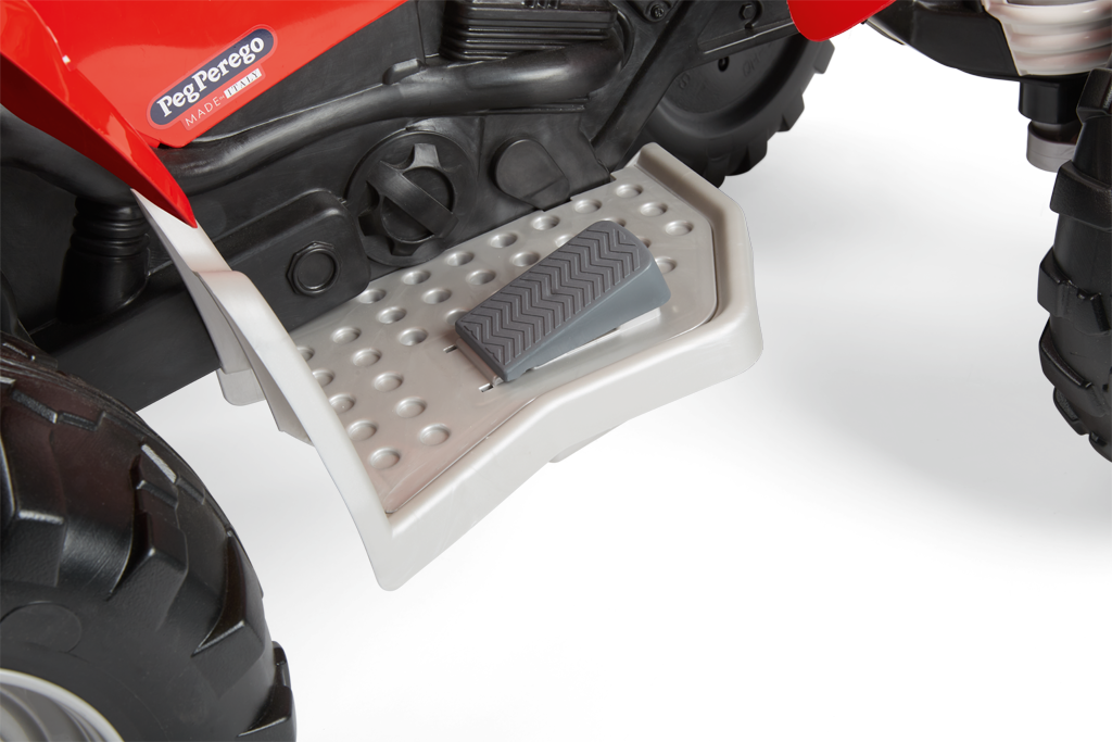 Qualität und Sicherheit aus dem Hause Peg Perego. Die Qualität der Produkte von Peg Perego ist an den Einzelheiten zu erkennen, die die Sicherheit garantieren. Das Polaris Outlaw hat einen geschlossenen Unterboden, um den Fahrer vor Stromkabeln und eventuellen Verletzungen zu schützen und Spritzwasser, Matsch und Sand vom Fahrzeug fern zu halten.