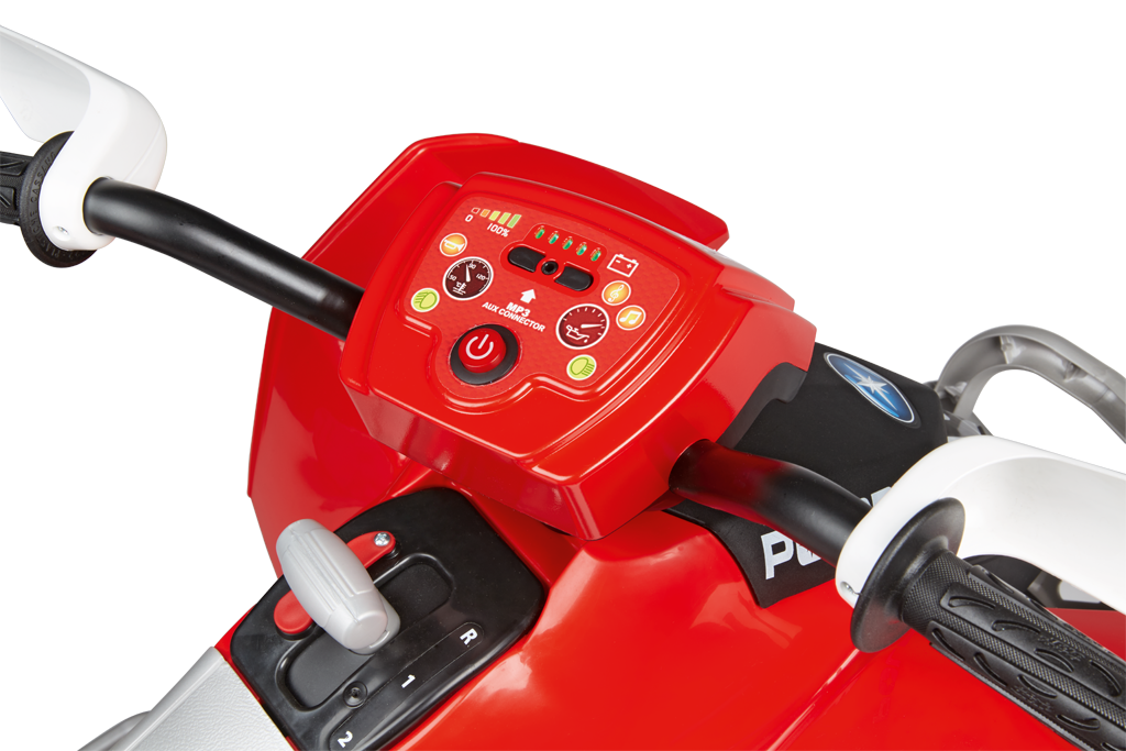 Geradlinige Lenkung, bequeme Fahrt. Das Polaris Outlaw verfügt über viele Details. Der widerstandsfähige Lenker aus glänzend lackiertem Eisen hat zwei Gummigriffe und Handschützer. Am Tachometer befindet sich ein Schlüssel, mit dem das Anlassen simuliert werden kann. Der Schalthebel auf dem Tank kann in zwei Vorwärts- oder den Rückwärtsgang geschaltet werden. Die zweite, höhere Geschwindigkeit kann blockiert werden, wenn der kleine Fahrer noch unsicher ist.