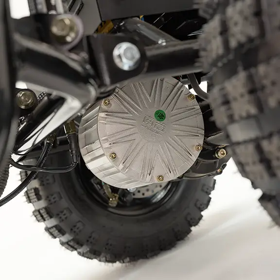 Um den Buggy auch sicher und schnell abbremsen zu können, ist es mit einer hydraulischen Bremsanlage ausgestattet. Gebremst wird die Hinterachse an beiden Rädern mittels Scheibenbremse. Angetrieben wird das Gefährt von einem kraftvollen und fast geräuschlosen 2000W Brushless-Motor, die Kraftübertragung auf die Hinterachse erfolgt direkt, also keine Kette, keine Verschleißteile.